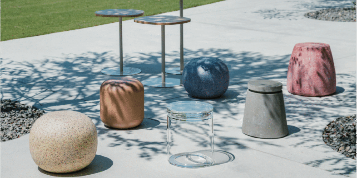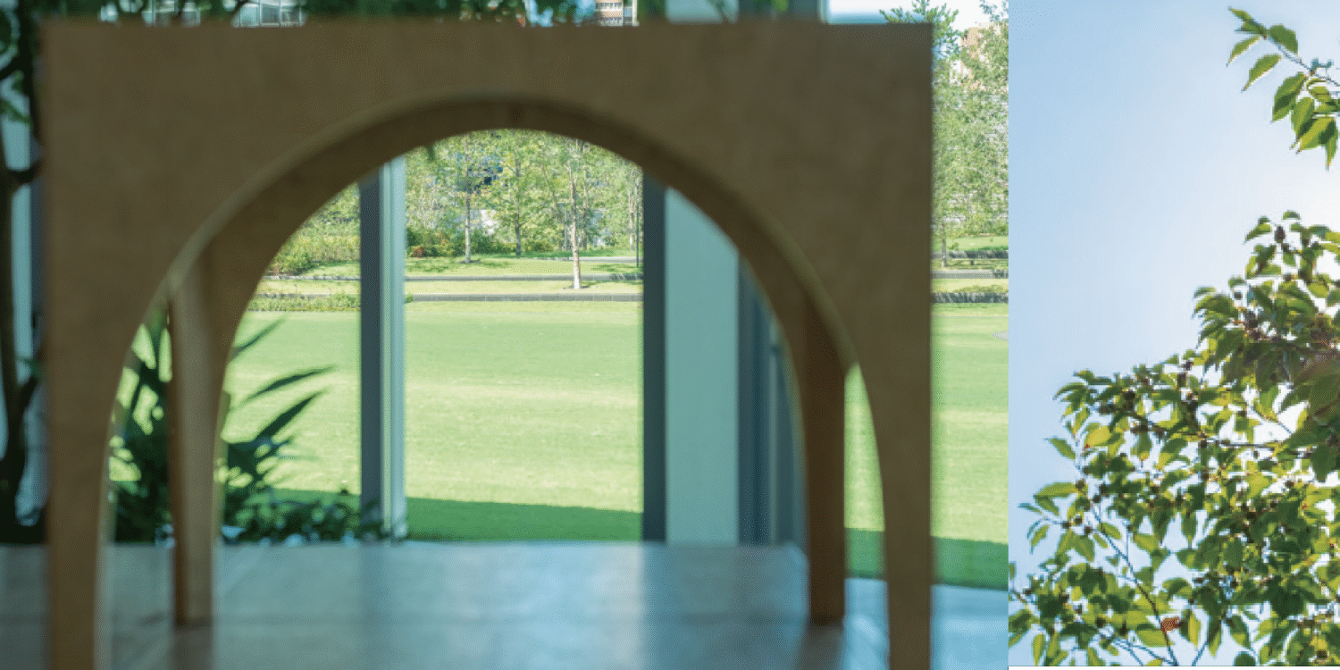 2 - SUSTAINABLE(気づきを与える): 公園の植栽に用いられる「客土」を左官材に活用した「インフォカウンター」や、展示什器には木の香りのする国産杉の間伐材を活用。公園に転がる「石ころ」をモチーフにした暮らしを取り巻くマテリアルを「ころ」として施設内に配置することで、小さな気づきや疑問を与え、眼差しを変えるきっかけを生む設計に仕上げました。